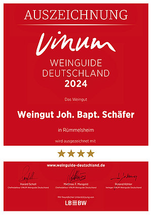"Im aktuellen VINUM Weinguide 2023 werden wir wieder mit 4 Sternen als "Deutsche Spitze, Weingut mit internationalem Renommee" bewertet: "Während andere Winzer versuchen, ihren Weinen einen persönlichen Stempel aufzudrücken, zum Beispiel Reduktionsnoten stärker herauszuarbeiten oder gar zu erzwingen, hat man hier das Gefühl, dass Sebastian Schäfer seinen Weinen in diesem Jahr noch mehr Raum gelassen hat, sich zu entfalten. Die ganze Serie wirkt in sich ruhend uns gefällt dieser entspannte Stil sehr gut. Ausgezeichnet ist auch diesmal die Scheurebe gelungen. In der Nase ist sie geprägt von präsenten Fruchtnoten, am Gaumen dann schlank mit Cassis, Grapefruit und feiner Brennnessel.!"