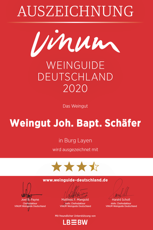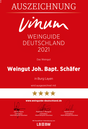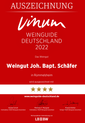 Im aktuellen VINUM Weinguide 2022 werden wir wieder mit 4 Sternen als "Deutsche Spitze, Weingut mit internationalem Renommee" bewertet: "Sebastian Schäfer stellt vom Jahrgang 2020 eine rundum gelungene Kollektion vor. Schon die Gutsweine machen richtig Spaß... Es gibt ein Lobeslied auf die fruchtsüßen Weine: "Die frucht- und edelsüßen Weine können zu den besten an der Nahe gehören. Sebastian Schäfer versteht es, die sonnenverwöhnten Lagen der unteren Nahe so zu nutzen, dass seine restsüßen Weine über eine kühle, hochfeine Eleganz verfügen und trotzdem eine saftige Tiefe behalten, die sie sehr animierend und trinkfreudig macht..."