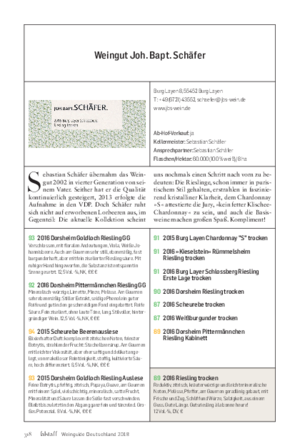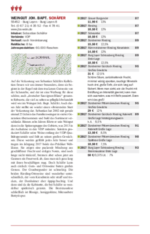 "Auf die Verkostung von Sebastian Schäfers Kollektion freuen wir uns immer besonders, denn sie beginnt in der Regel mit dem trockenen Gutswein von der Scheurebe... auch dieses Jahr stellte sie wieder einen vibrierenden Start der Verkostung dar... Binnen zehn Jahren führte Schäfer sein Weingut in die Spitzengruppe des Gebiets, was 2013 in die Aufnahme in den VDP mündete. Seitdem produziert Schäfer seine Weine entlang der VDP-Qualitätspyramide und feilt an seinen großen Gewächsen. Diese werden gefühlt jedes Jahr besser und tragen im Jahrgang 2017 beide das Prädikat Weltklasse..."