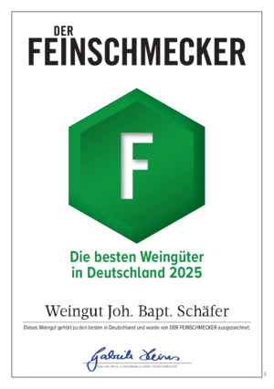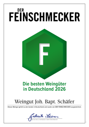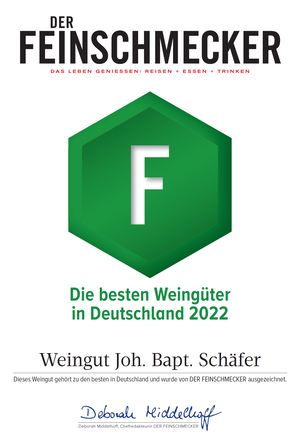 Das Gourmet-Magazin "Der Feinschmecker", Ausgabe 01/2021 zählt uns zu den 500 besten Winzern Deutschlands, wir steigen auf und erhalten die Wertung von 3 F: "Gratulation! Mit seiner aktuellen Kollektion kann Sebastian Schäfer seine Bewertung verbessern. Schon der Weißburgunder überzeugt mit seiner eleganten Art, ein bestens austarierter Wein mit Charakter und Charme. Nicht weniger Freude machen die trocken ausgebauten Rieslinge, die sehr konzentriert, straff und komplex wirken, dabei dennoch ihr finessenreiches Spiel zwischen Frucht und Säure mit einer gewissen Leichtigkeit auf die Zunge bringen. Schön, dass Schäfer auch 2019 den Kabinett hochhält und mit seinem Pittermännchen Riesling für unkomplizierten, erfrischenden Trinkspaß sorgt. Weiter so!"