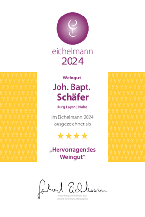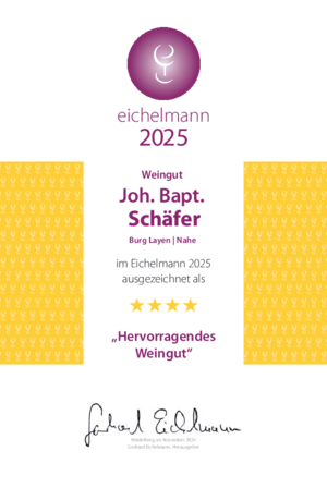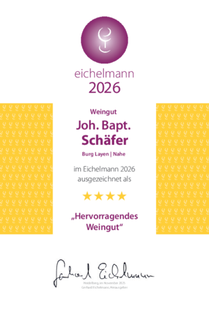 Wir erhalten wieder 4 Sterne im Eichelmanns Weine 2026 und zählen zu den “Hervorragenden Erzeugern”: …Sebastian Schäfer präsentiert einmal mehr eine sehr gelungene Kollektion, brillanter, fein saftiger und präziser Weißweine. Der Weißburgunder Flusskiesel passt bestens ins Bild der gesamten Kollektion, er ist fein, ausgewogen, zeigt sich attraktiv frisch und saftig, besitzt Substanz und Länge… Der herrlich animierende, saftige und würzige Kabinett mit seiner herben tropischen Frucht und ausgeprägten Mineralität bildet einen gelungenen Schlusspunkt einer Kollektion, die zu den besten des Jahrgangs an der Nahe gehört." Eichelmann 2026 mehr lesen…