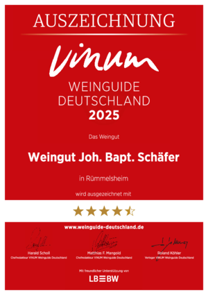 Wir steigen auf im aktuellen VINUM Weinguide 2025 und erhalten 4,5 Sterne als Betriebswertung und zählen zu den absoluten Spitzenbetrieben Deutschlands! “Das Weingut Joh. Bapt. Schäfer präsentiert unter der Leitung von Winzer Sebastian Schäfer eine beeindruckende und stimmige Kollektion des Jahrgangs 2023, die durch noch präzisere Weine besticht…. Es ist an der Zeit, dass Sebastian Schäfer, das jüngste Mitglied im VDP-Nahe (2013), die Anerkennung erhält, die er verdient. Er steht für konstant herausragende Qualität und sollte nicht länger unter dem Radar bleiben. Seine Weine stehen für höchste Qualität. Seit 2023 ist das Weingut auch nachhaltig zertifiziert. Es ist an der Zeit, dass seine außergewöhnliche Arbeit die verdiente Aufmerksamkeit bekommt. Wir gratulieren zur Aufwertung!”… mehr lesen