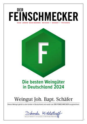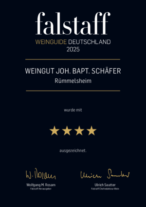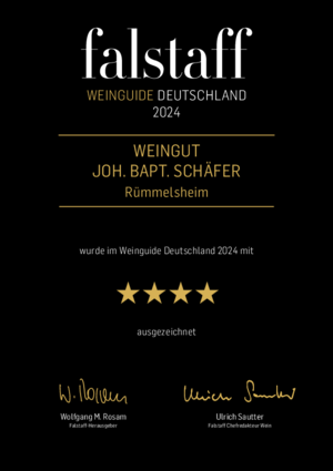 Im neuen Falstaff Weinguide 2024 werden unsere Weine in den höchsten Tönen gelobt: „…Sebastian Schäfer vom Weingut Joh. Bapt. Schäfer ist es im Jahrgang 2022 noch gelungen, das großartige Rieslingjahr 2021 zu übertreffen. Egal, ob die famosen Großen Gewächse aus Goldloch und Pittermännchen, die Ersten Lagen wie Schlossberg oder die Ortsweine: Der zurückhaltende Winzer hat mit Sorgfalt und Können jedem seiner Etiketten eine Lebendigkeit bei perfekt dosierter Substanz mitgegeben, sodass schon jetzt großer Genuss, aber auch die Entwicklung in der Schatzkammer angelegt sind…“