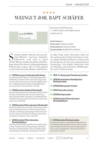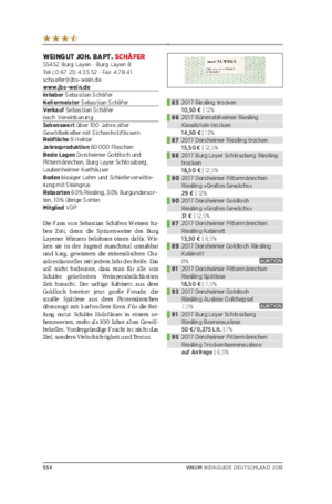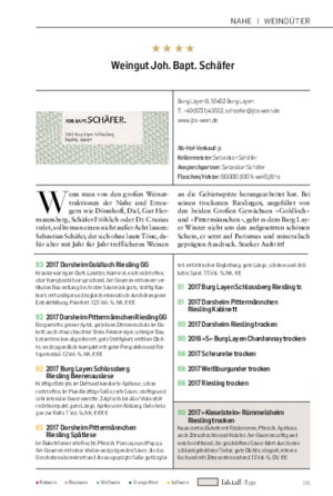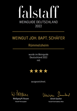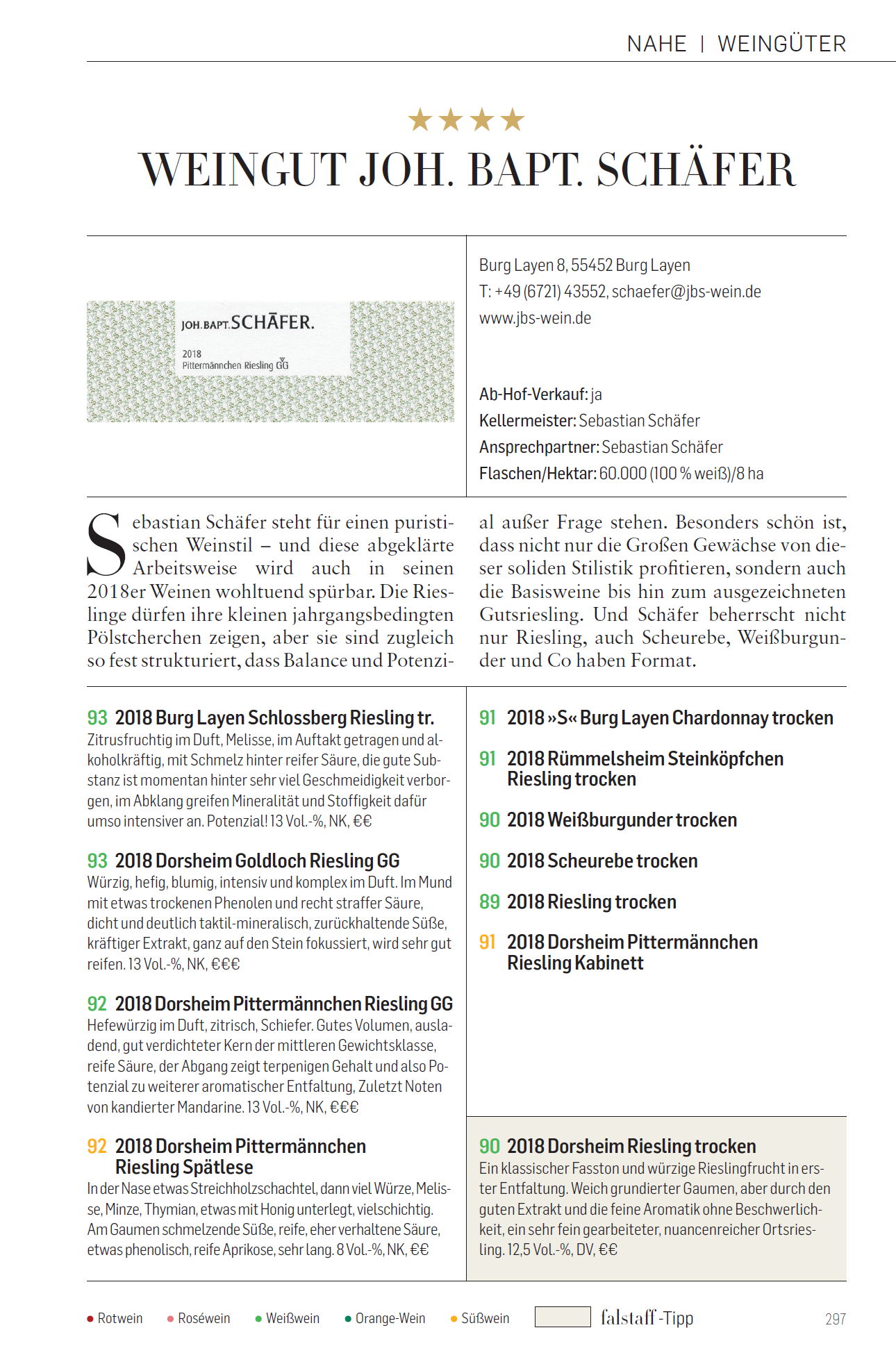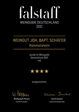 Wir erhalten im neuen Falstaff Weinguide 2019 vier Sterne als Bewertung „Starker Auftritt: Familie Schäfer vom Weingut Joh. Bapt. Schäfer überzeugt mit puristischen Rieslingen." ...wenn man von den großen Weinattraktionen und Erzeugern wie Dönnhoff, Diel Gut Hermannsberg, Schäfer-Fröhlich oder Dr. Crusius redet, sollte man einen nicht außer Acht lassen: Sebastian Schäfer, der sich ohne laute Töne, dafür aber mit Jahr für Jahr trefflicheren Weinen an die Gebietsspitze herangearbeitet hat."