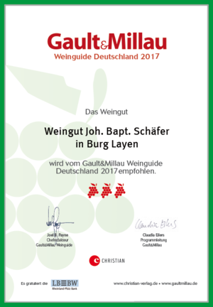 Im Gault Millau Weinguide 2017 werden wir mit drei Roten Trauben bewertet: „Sebastian Schäfer stellt mit dem Jahrgang 2015 erneut eine starke Kollektion vor. Schon die Basisweine überzeugen, etwa die feine Scheurebe oder auch der cremige Grauburgunder. Schäfers trockene Rieslinge sind alle sehr karg im Stil, haben aber das Potenzial zur Entwicklung. Das gilt erst recht für die beiden Großen Gewächse, wobei wir in diesem Jahr das Goldloch vor dem Pittermännchen sehen. Der junge Burg Layer Winzer präsentiert eine ganze Reihe wunderbarer fruchtiger und edelsüßer Weine. Die Auslese Goldkapsel aus dem Goldloch gehört zu den besten im Gebiet. Die eher dezente Scheurebe Beerenauslese erinnert verblüffend an Pink Grapefruit und die konzentrierte Trockenbeerenauslese krönt eine beachtliche Reihe.“