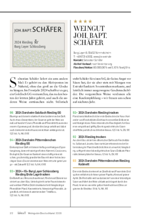 “Erneut beweist Sebastian Schäfer, dass seine Kollektion zu den konstant starken an der Nahe gehört. Schon die Basisweine machen deutlich, welches Niveau hier erreicht wird…. Sebastian Schäfer bestätigt damit einmal mehr seinen Ruf: Ob Basiswein, Erste Lage oder Großes Gewächs - seine Weine sind präzise, charakterstark und gleichzeitig zugänglich. Eine Kollektion, die Freude bereitet und Lust macht, jeden Wein im Glas zu entdecken…”