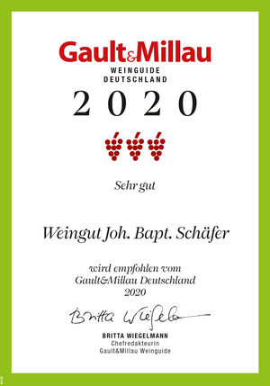 In der Ausgabe 09/2019 vom renommierten Weinwisser-Magazin werden unsere beiden 2018er GG´s mit Höchstnoten bewertet: ... Stark verbessert zeigen sich die Weine von Joh. Bapt. Schäfer, die ich hier noch nie so gut probiert habe..."
