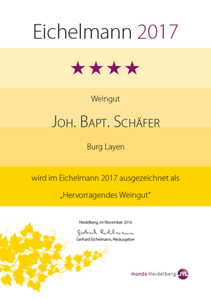 Im neuen Eichelmann-Weinführer 2017 werden wir mit 4 von 5 Sternen bewertet. „Betriebe wie Joh. Bapt. Schäfer erzeugen seit den neunziger Jahren edelsüße Rieslinge, die zur deutschen Spitze zählen.“ „…auch die trockenen Weine zeigen wieder viel Klasse, schon der Gutsriesling ist stark, zeigt Kräuterwürze und steinige Noten, ist schlank und animierend (87 Punkte)… der Rümmelsheim Riesling ist herrlich komplex im Bouquet, duftet nach Kräutern, Blumenladen, Brotkruste und Tabak, die Frucht bleibt ganz im Hintergrund, er ist gradlinig und lang (89 Punkte)… Weitere Topbewertungen: Burg Layer Schlossberg Riesling trocken: 90 Punkte, Pittermännchen GG: 91 Punkte, Goldloch GG: 91 Punkte,