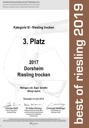 Beim größten Riesling-Wettbewerb der Welt "Best of Riesling", der vom Meininger Verlag und vom rheinland-pfälzischen Ministerium durchgeführt wurde, erzielen wir den sensationellen 3. Platz in der Kategorie III Riesling trocken mit unserem 2017 Dorsheim Riesling VDP.ORTSWEIN mit 92 Punkten. Insgesamt wurden über 2.400 Rieslinge aus 14 Ländern zu dem Wettbewerb angestellt. Im Jahr 2017 haben wir bereits schon mal mit unserem Dorsheim Riesling, Jahrgang 2016 den 1. Platz beim "Best of Riesling" gewonnen.